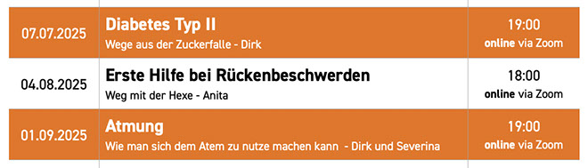 An jedem ersten Montag im Monat laden wir euch um 18 oder 19 Uhr zu interessanten Kurzvorträgen und Diskussionen rund um verschiedene Gesundheitsthemen ein. Die Teilnahme ist kostenlos - nutzt den Link rechts und schon seid ihr dabei!
